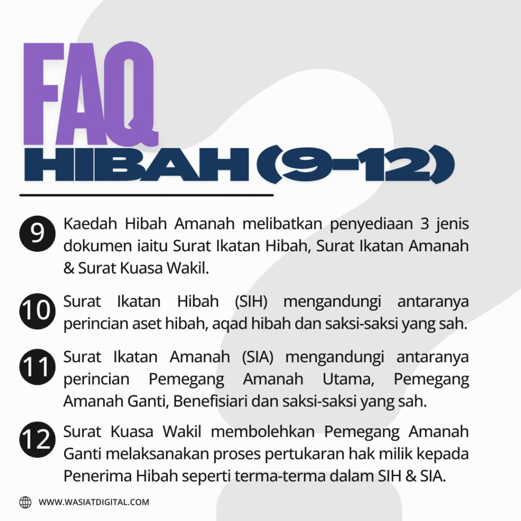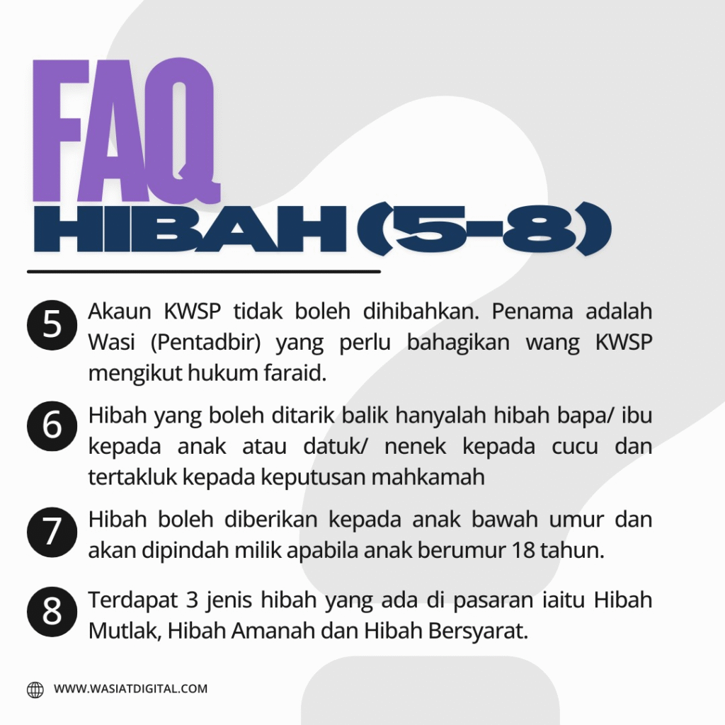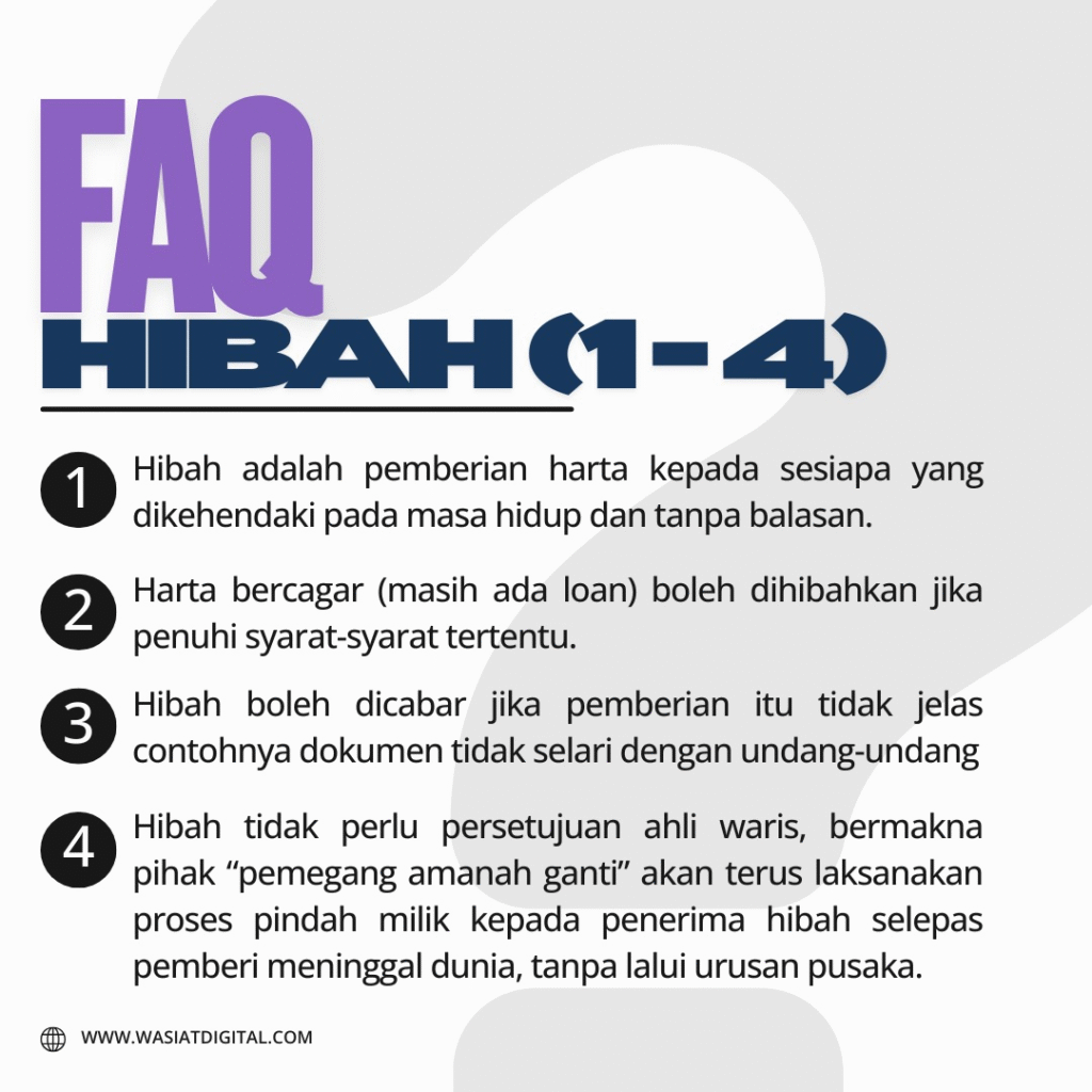 FAQ Ringkas Mengenai HibahBy wasiatdigital.com / January 22, 2026 Apa perlu tahu mengenai Hibah? Jom lihat ringkasan di bawah. Info lanjut sila klik butang Whatsapp.